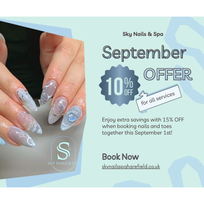 Your September just got prettier! Save more while looking fabulous: 10% OFF all services Extra 15% OFF nails + toes combo Limited-time only from September – Book your spot now! Notice: